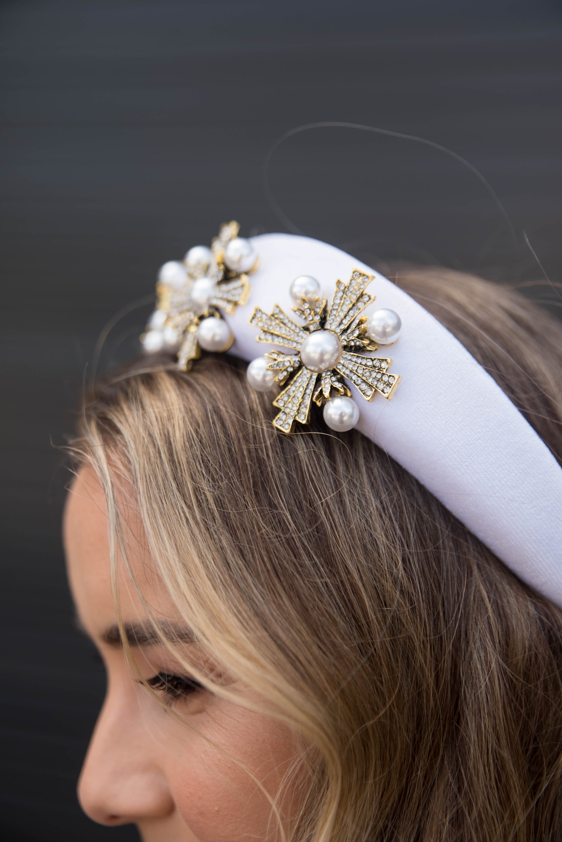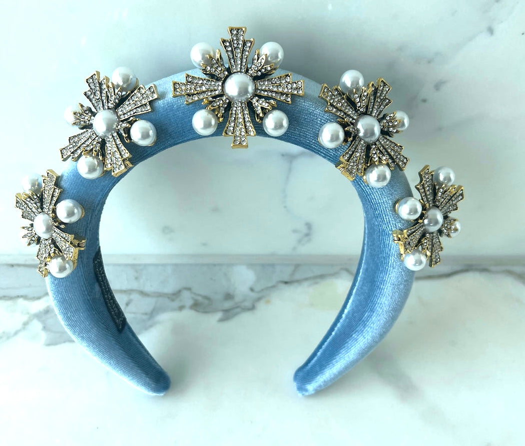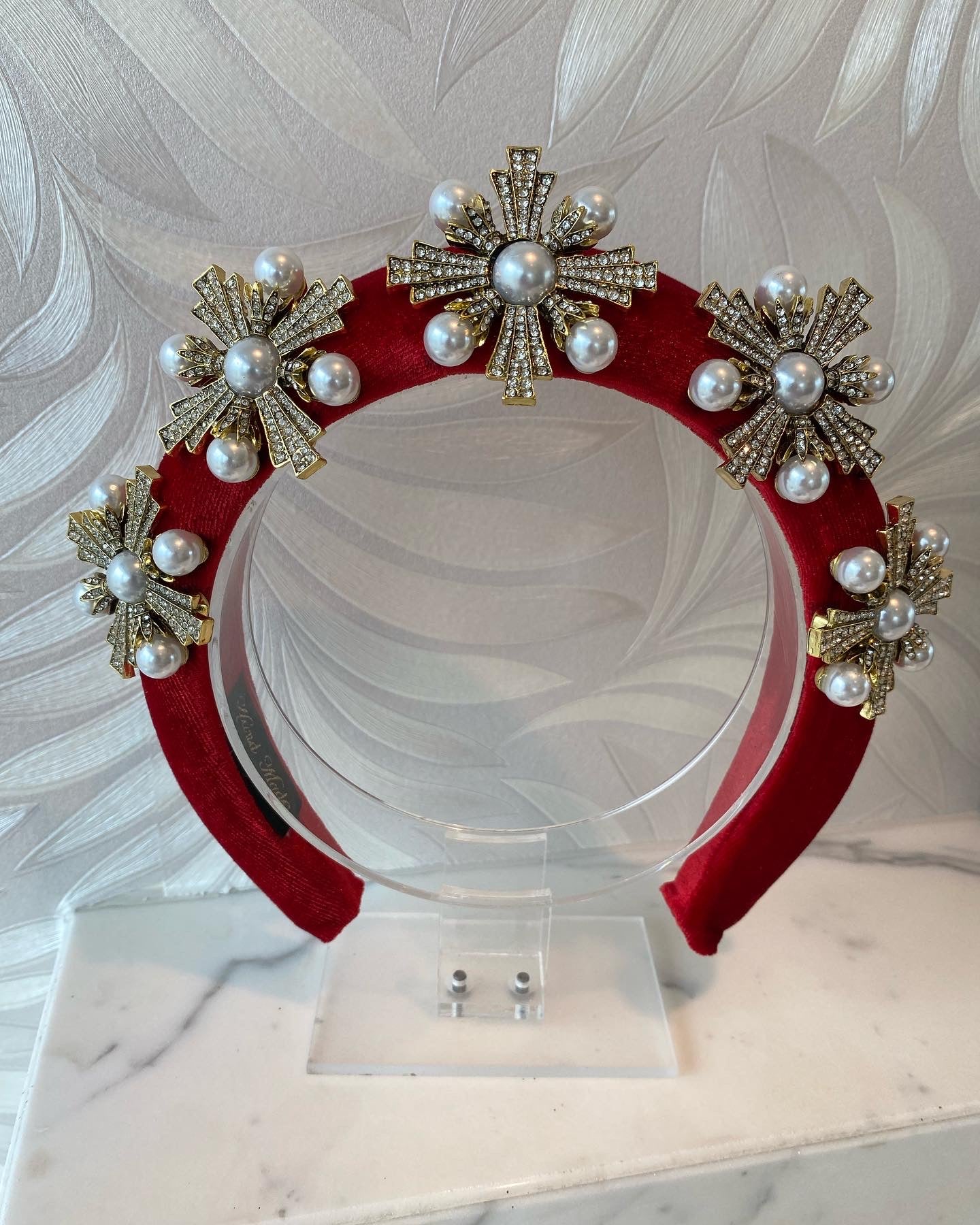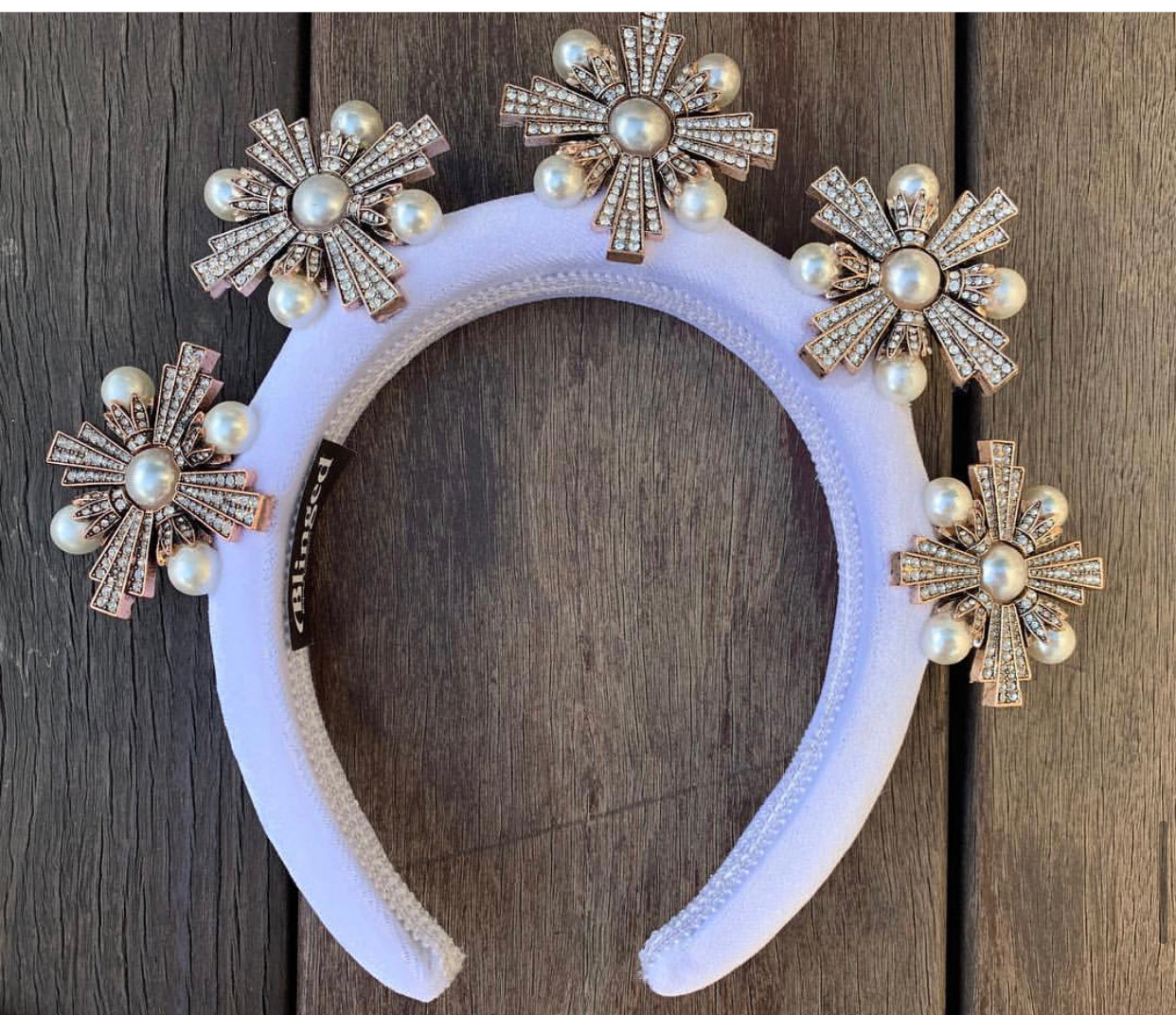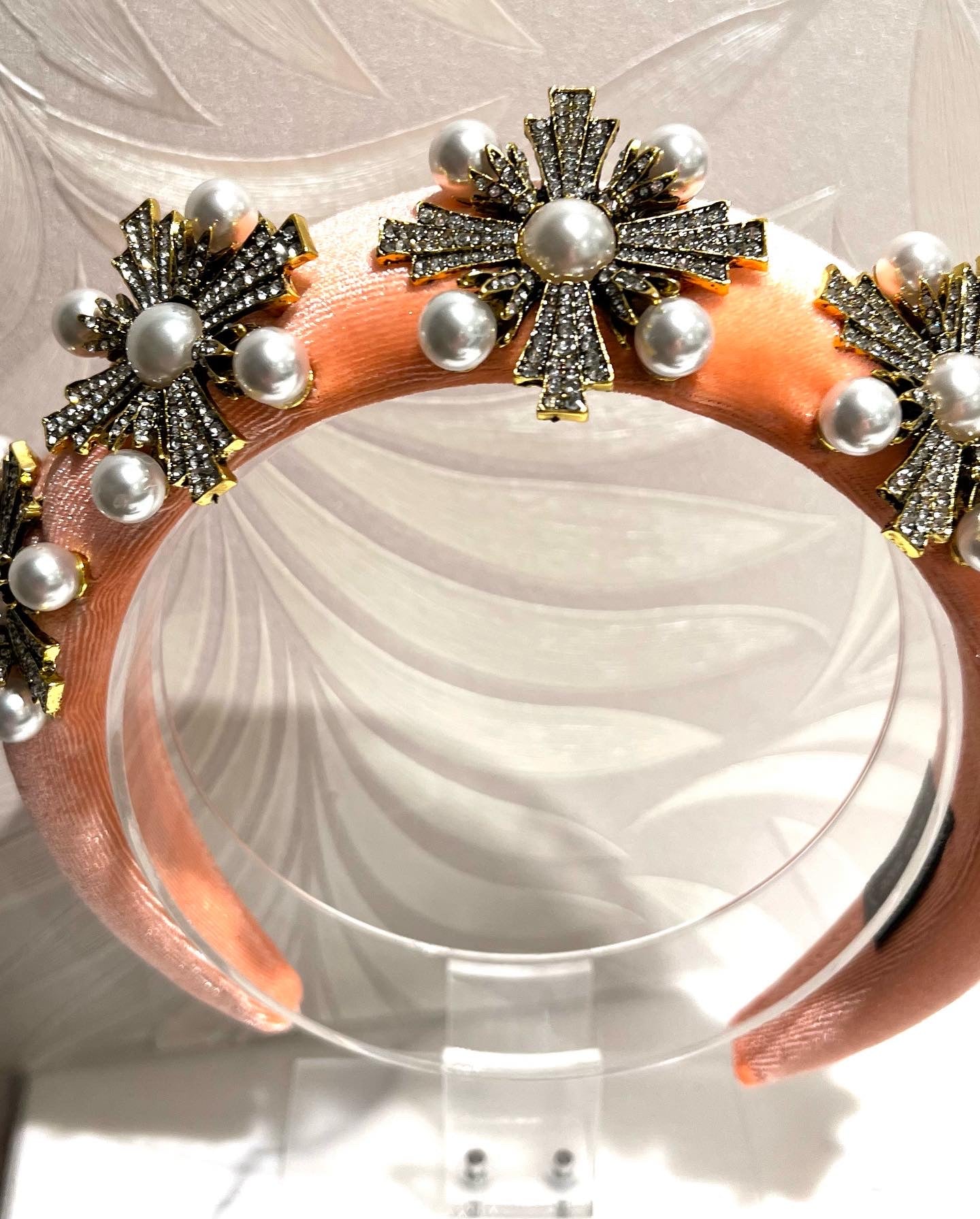 Our best selling Princess Kate crown is Art Deco inspired with its crystal and pearl embelishments nestled on a soft padded raised velvet headband.