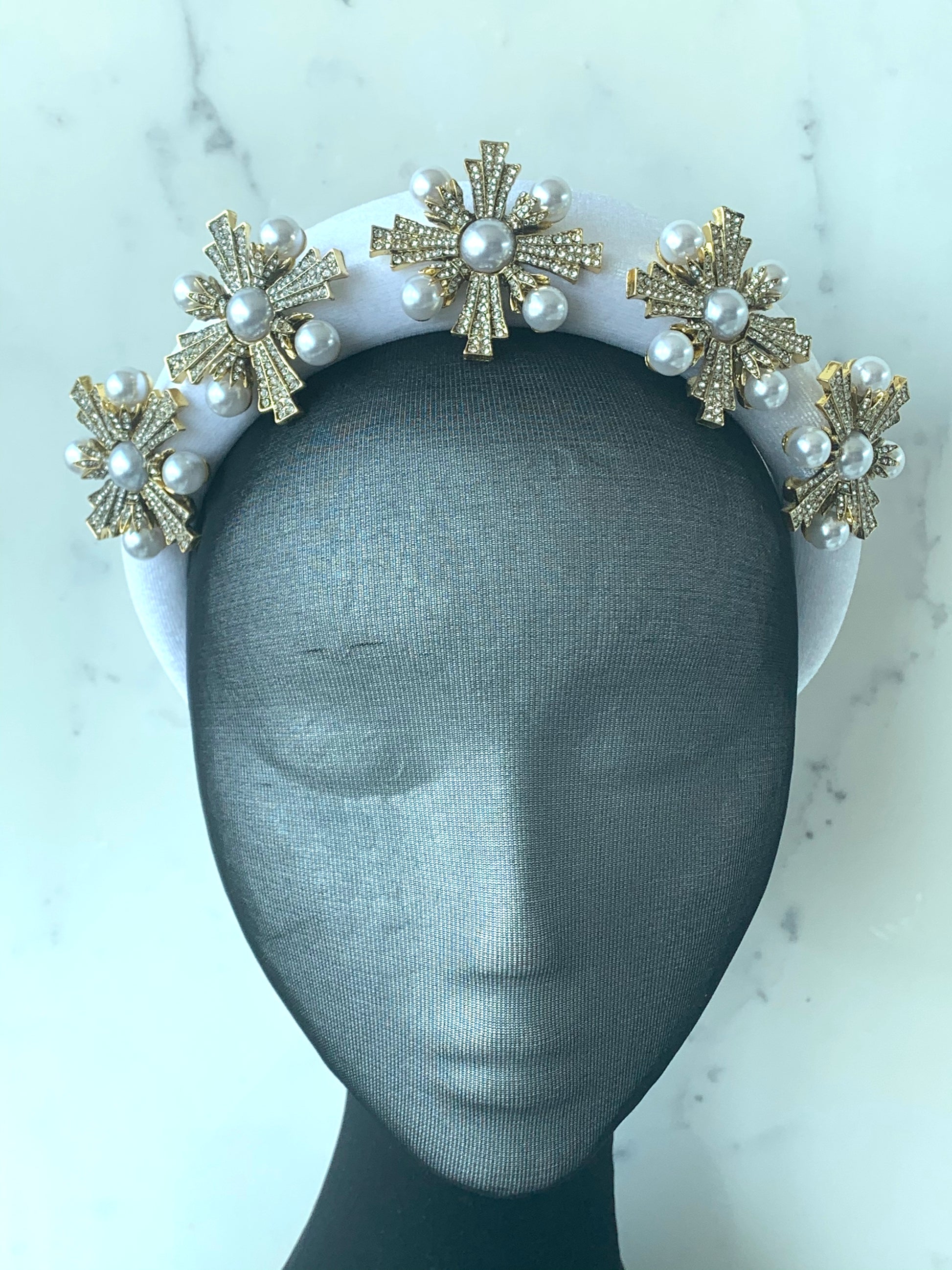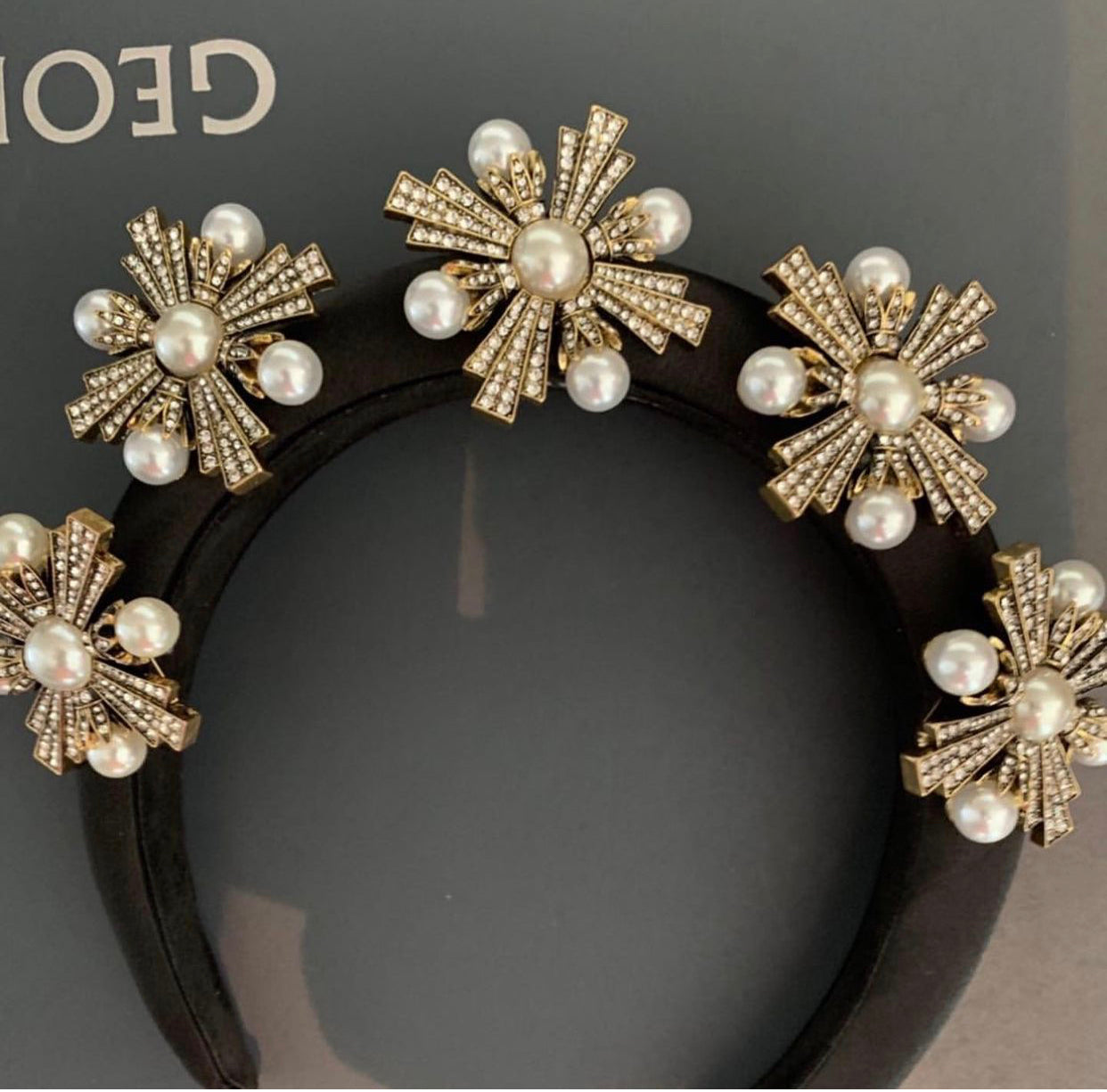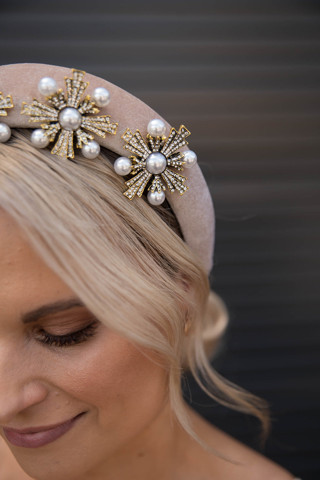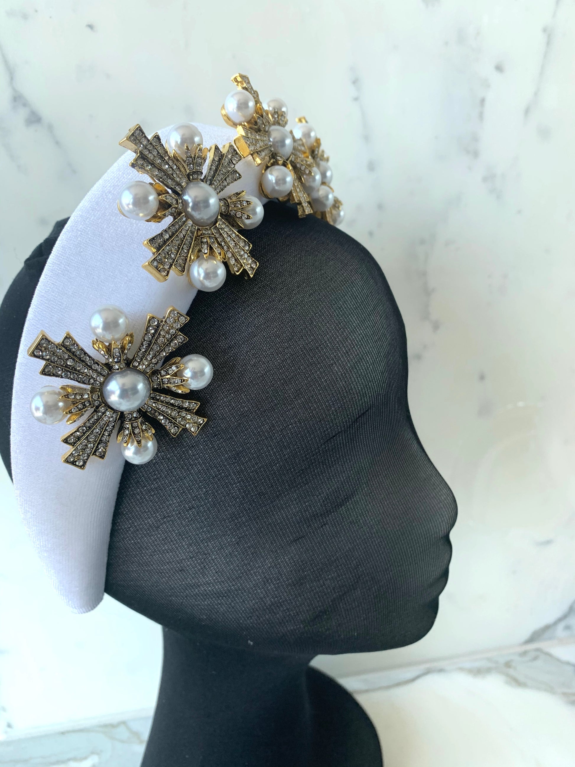 Our best selling Princess Kate crown is Art Deco inspired with its crystal and pearl embelishments nestled on a soft padded raised velvet headband.