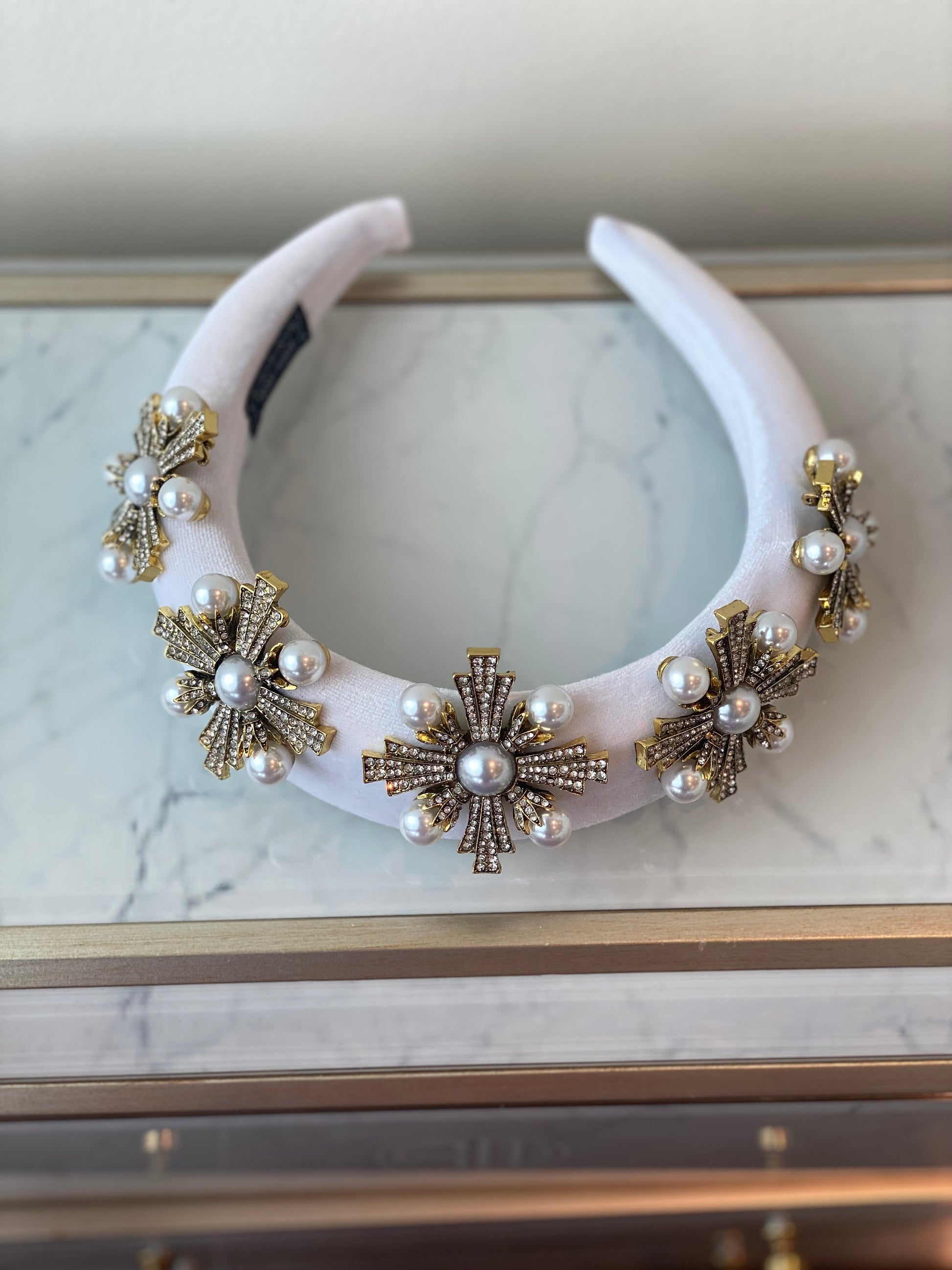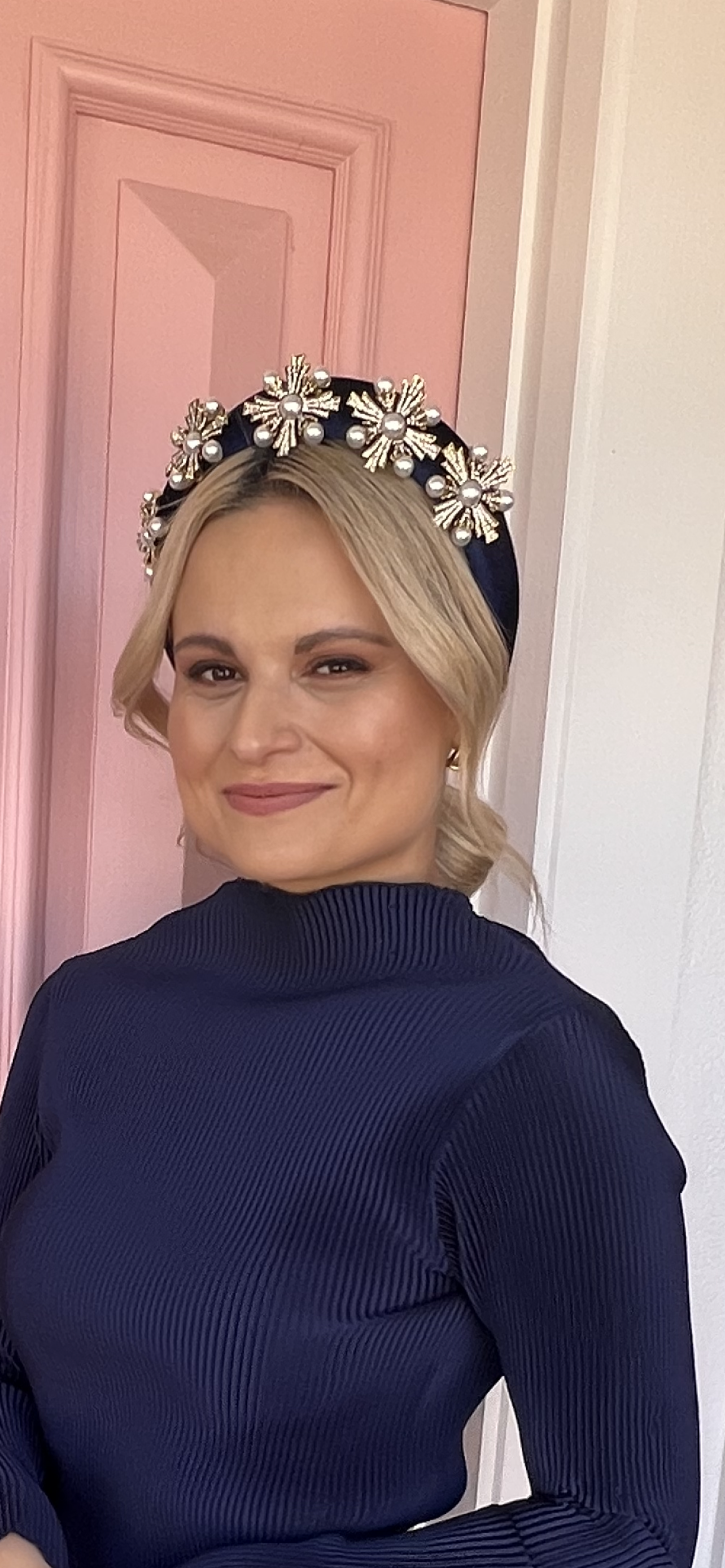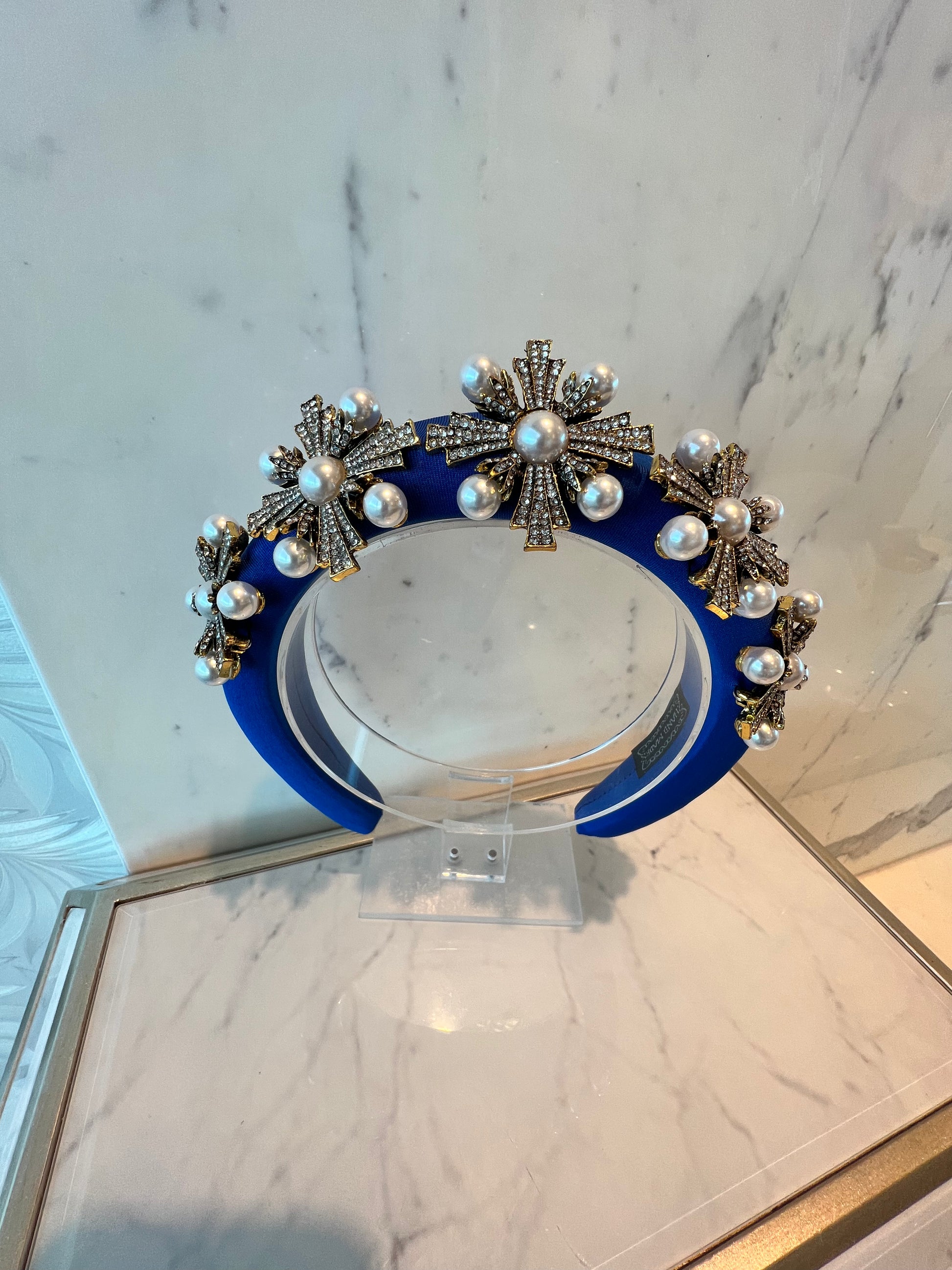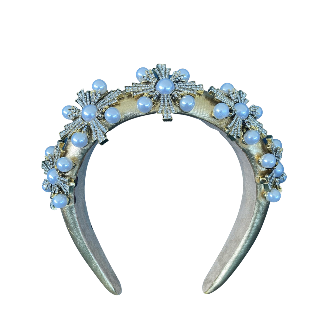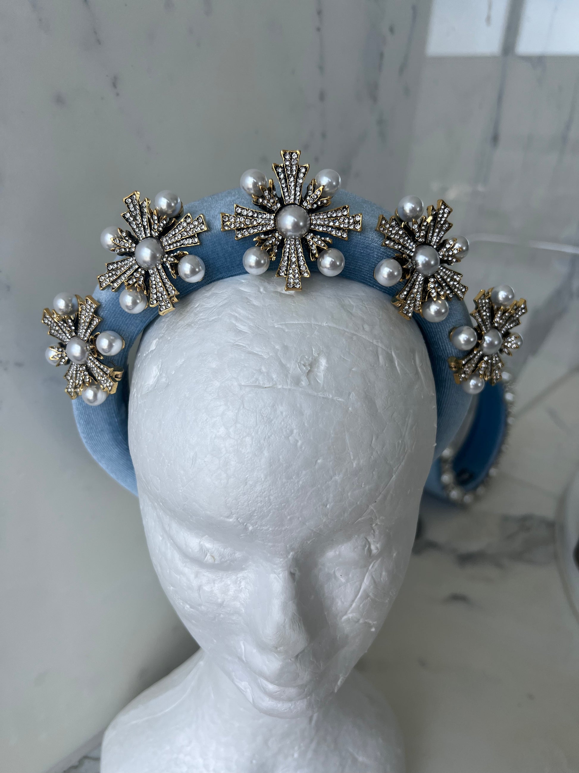 Our best selling Princess Kate crown is Art Deco inspired with its crystal and pearl embelishments nestled on a soft padded raised velvet headband.