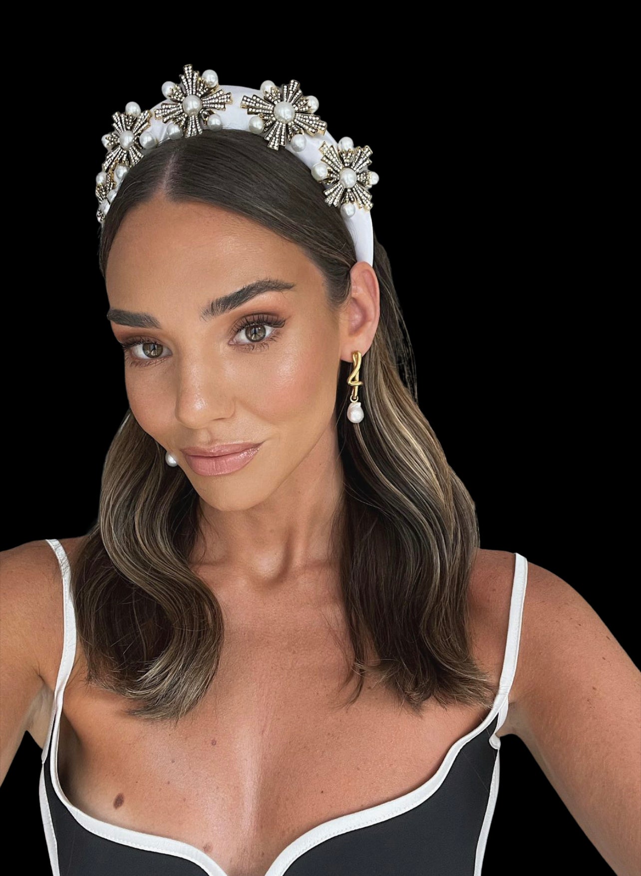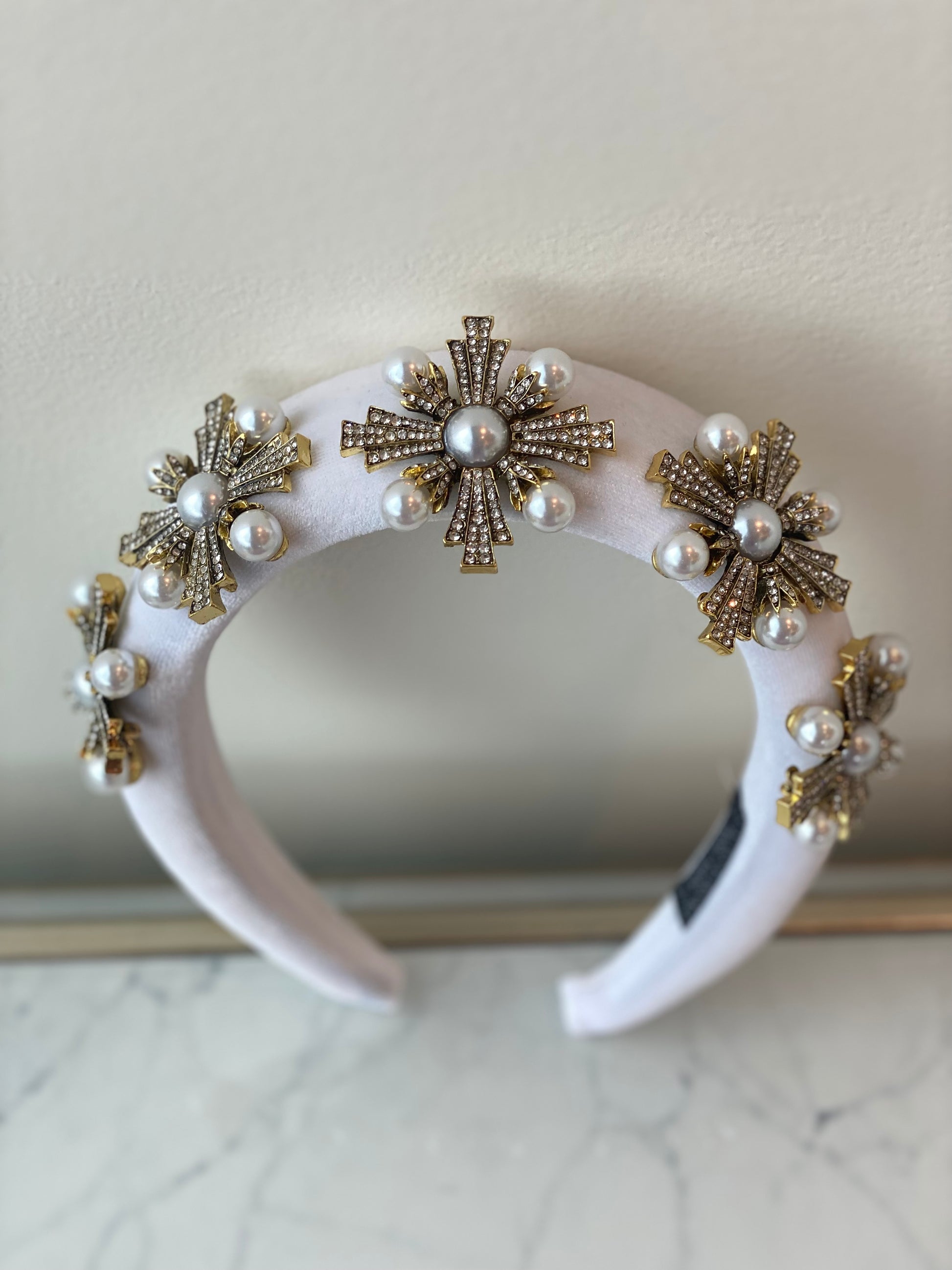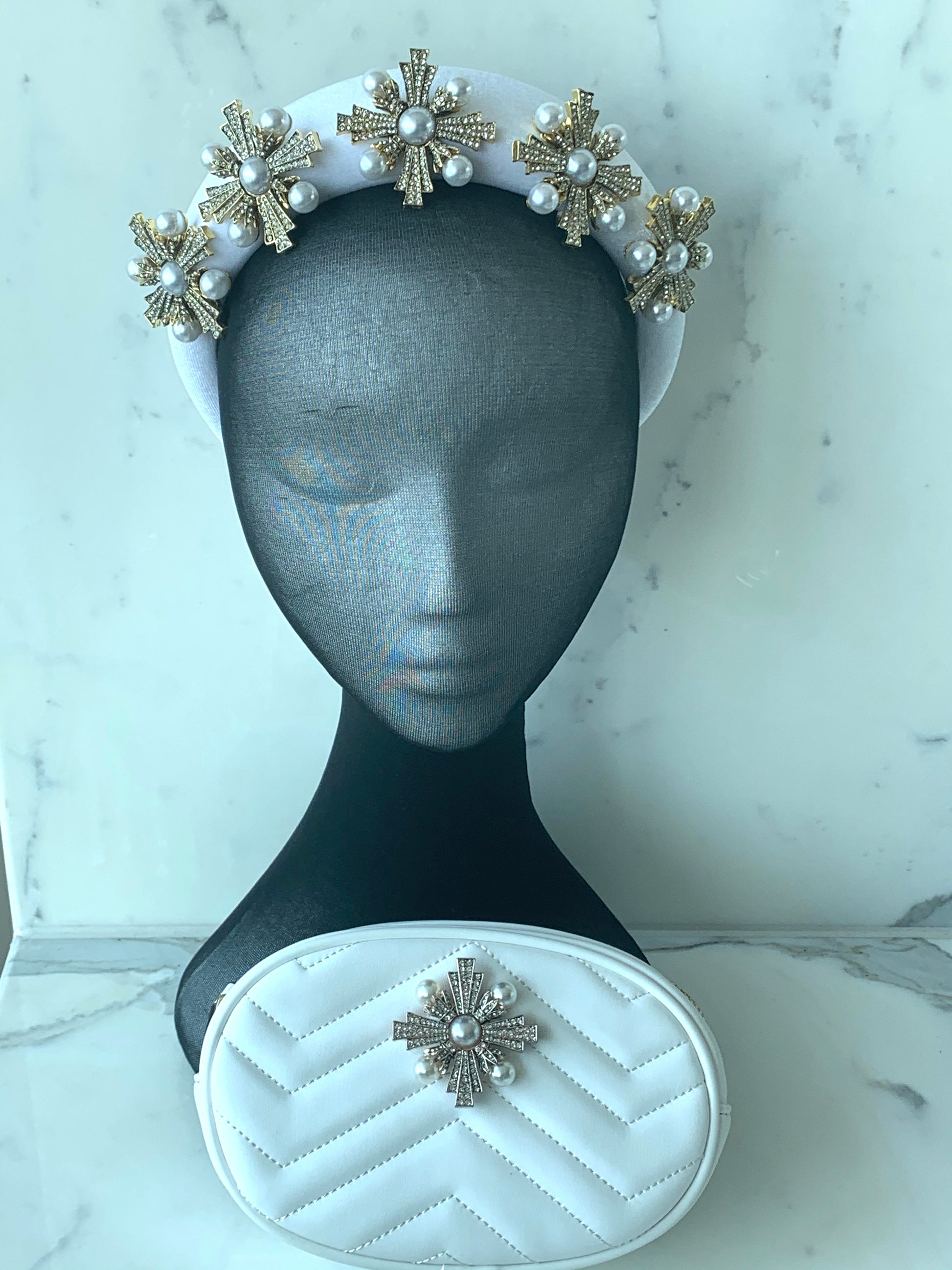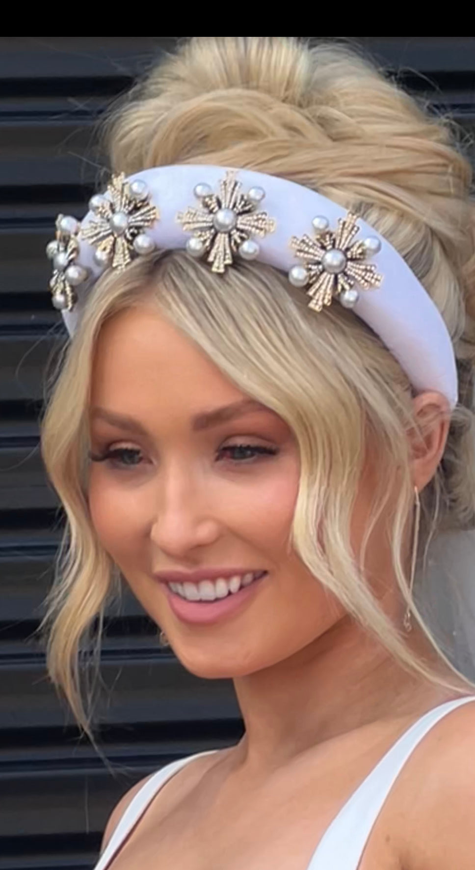 Our best selling Princess Kate crown is Art Deco inspired with its crystal and pearl embelishments nestled on a soft padded raised velvet headband.